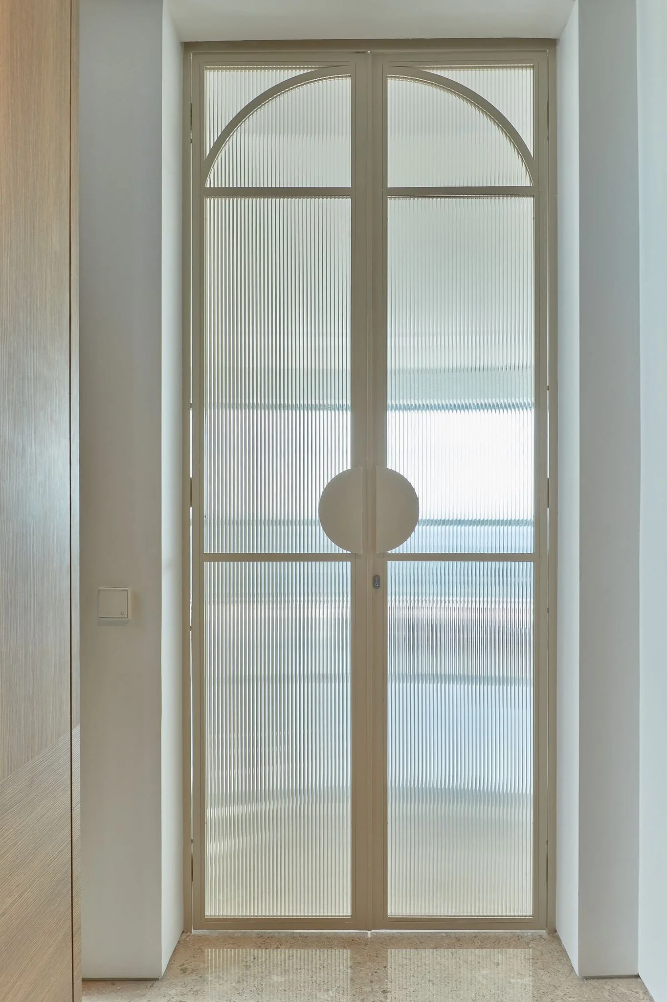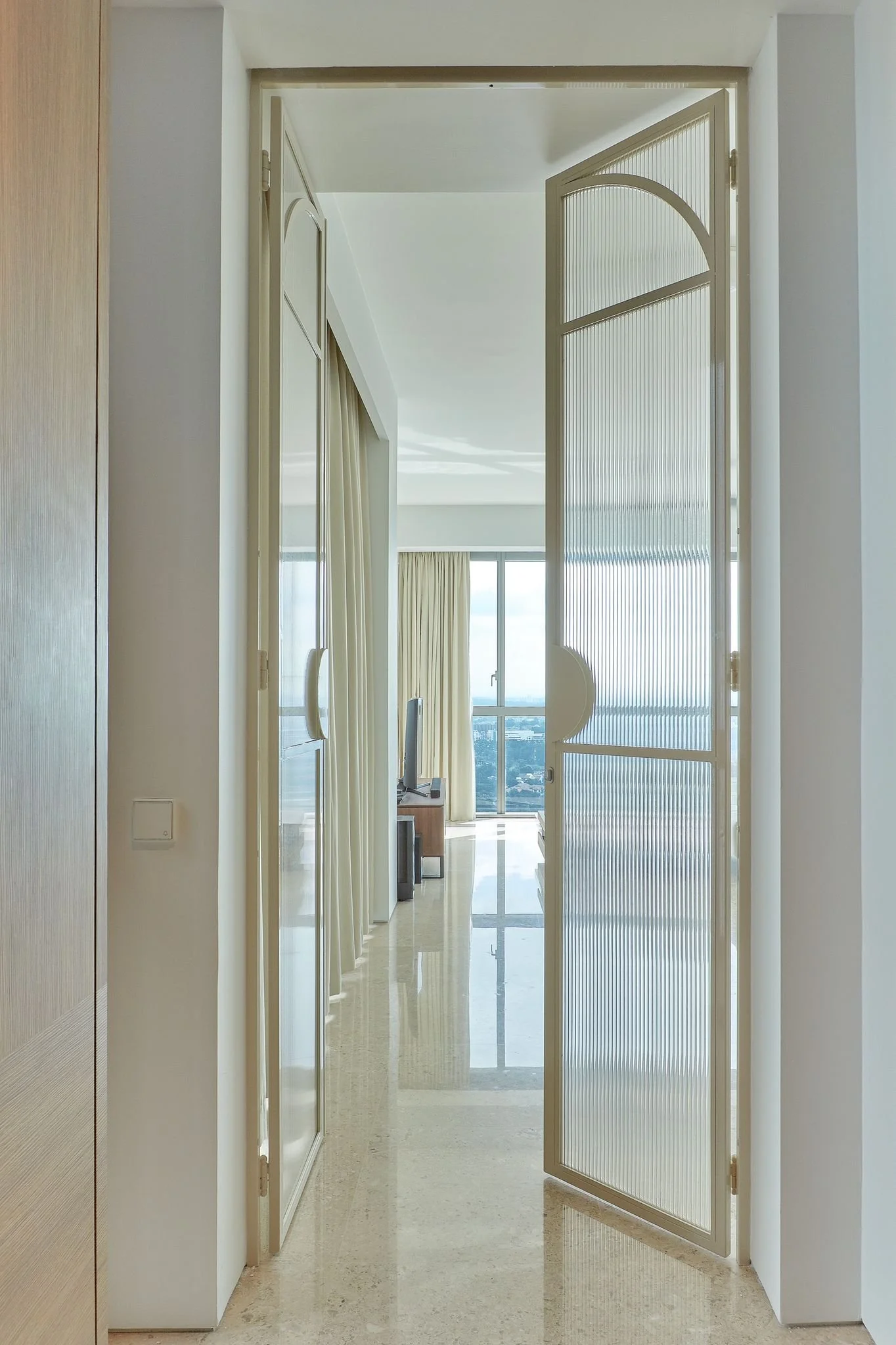 Understated luxury takes center stage with a stunning fluted glass main door that sets an elegant tone from the start. This modern interior leans into a crisp white palette, creating an airy, timeless space where light and openness flow freely.